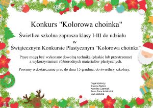 Świetlica szkolna zaprasza klasy I-III do udziału w ŚWIĄTECZNYM KONKURSIE PLASTYCZNYM „Kolorowa choinka”