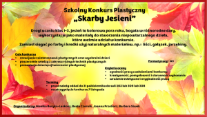 Szanowni Państwo, jesień to kolorowa pora roku, bogata w różnorodne dary, zapraszamy wszystkich uczniów klas 1-3 do wykorzystania ich jako materiałów do stworzenia niepowtarzalnego dzieła, które weźmie udział w Szkolnym Konkursie Plastycznym „SKARBY JESIENI”. Zamiast sięgać po farby i kredki prosimy użyć naturalnych materiałów, np.: liści, gałązek, jarzębiny. CELE KONKURSU rozwijanie zainteresowań plastycznych oraz wyobraźni dzieci poszerzenie wiedzy z zakresu różnych technik plastycznych prezentacja dziecięcej twórczości plastycznej FORMAT PRACY – A3 KRYTERIA OCENY zgodność pracy z założeniami konkursu kreatywność, pomysłowość i staranność wykonania wrażenie estetyczne i oryginalność pracy TERMINY prace należy oddać do 31 października do sali 302 lub 306 lub 308 rozstrzygnięcie konkursu 7 listopada ORGANIZATORZY Monika Boryka-Laskosz, Beata Czernik, Joanna Przeliorz, Barbara Siwek